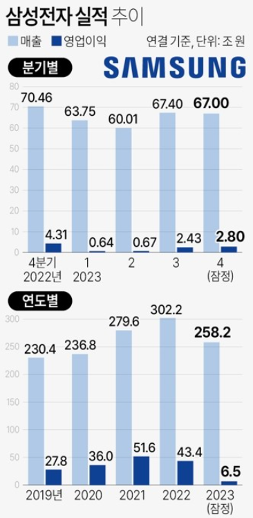 지난해 삼성전자는 반도체 업황의 악화로 15년 만에 최저의 연간 영업이익을 기록했습니다. 이 기간 동안의 연간 영업이익은 6조5천400억원으로 전년 대비 84.92% 감소한 것으로 나타났습니다. 이로 인해 매출도 14.58% 줄어든 258조1천600억원으로 집계되었습니다.